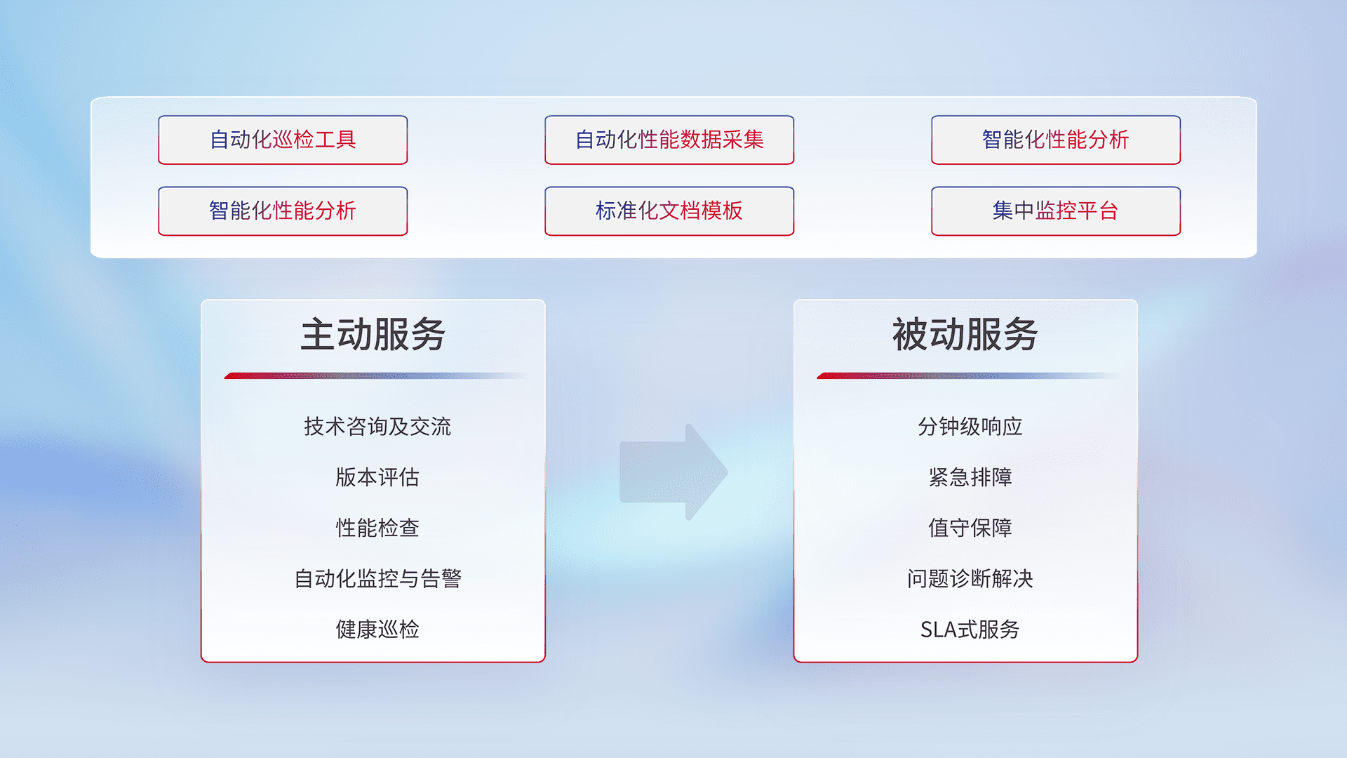 智能化工具和标准化文档,,,保障服务质量,,,提供主动服务(包含技术咨询、、、版本评估、、、性能检查、、、自动化监控与告警、、、、健康巡检)和被动服务包含(分钟级响应、、、、紧急排障、、、值守保障、、、、问题诊断解决、、SLA服务)。。。
