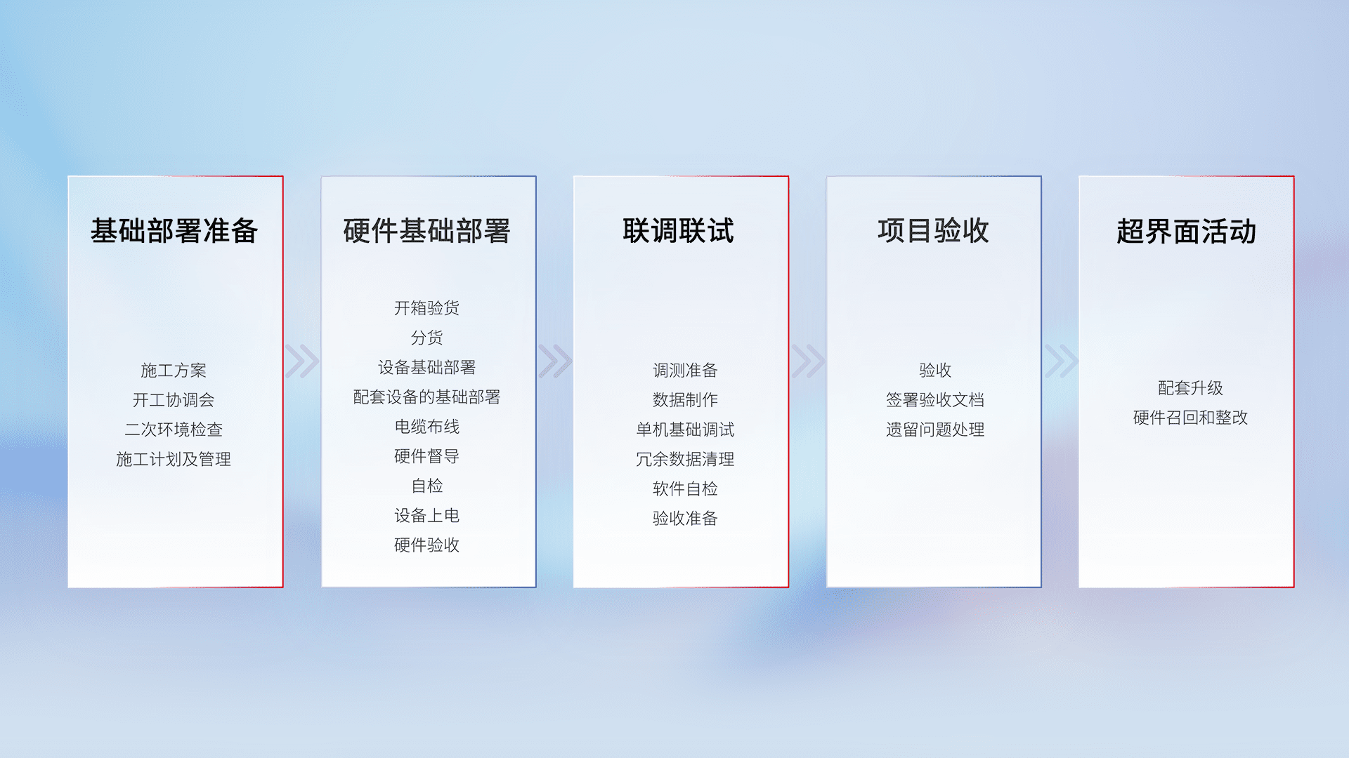 从基础部署准备、、、、硬件基础部署、、、联调联试、、、、项目验收、、、越界面活动的全过程可追溯,,保证施工质量和进度。。